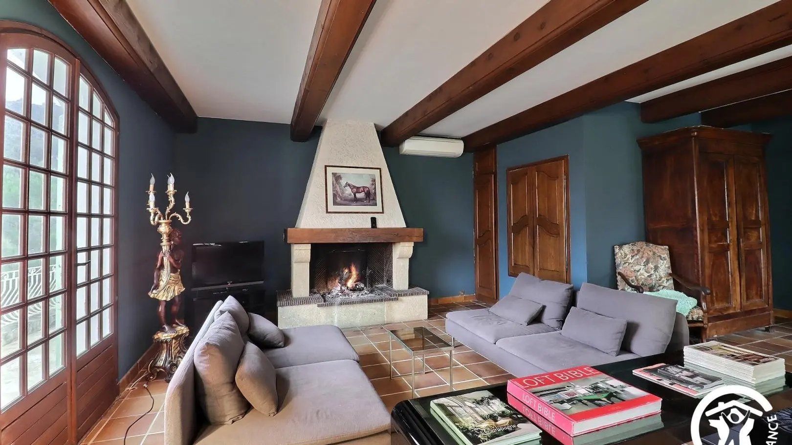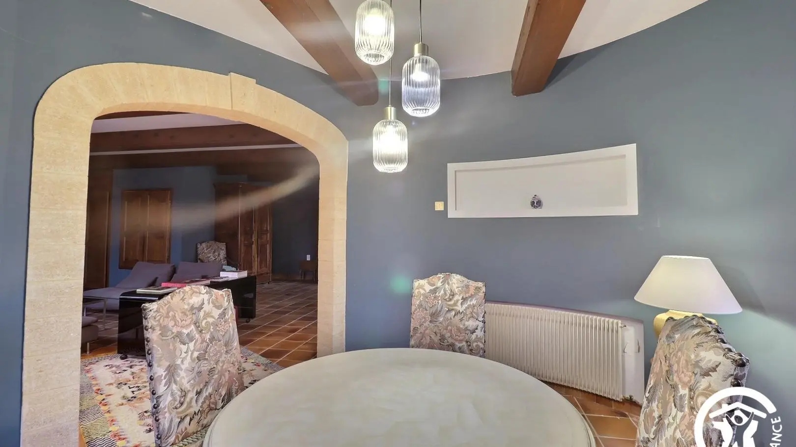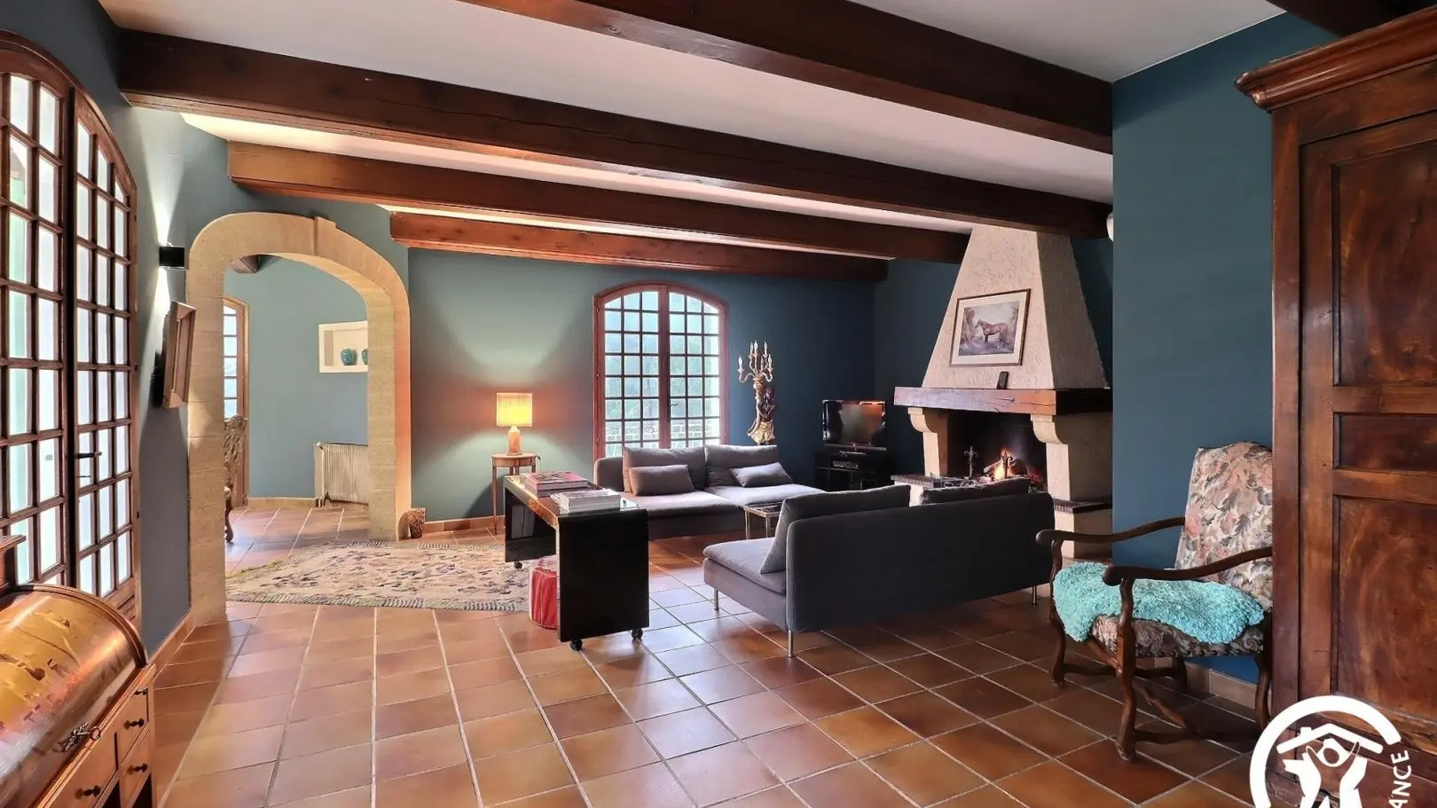 - Un salon avec deux canapés, fauteuils, TV et coin salle à manger