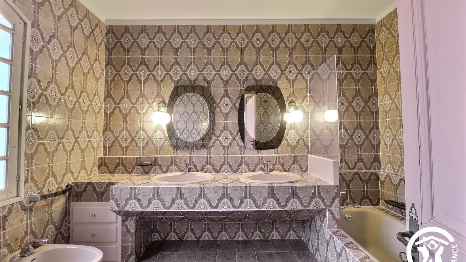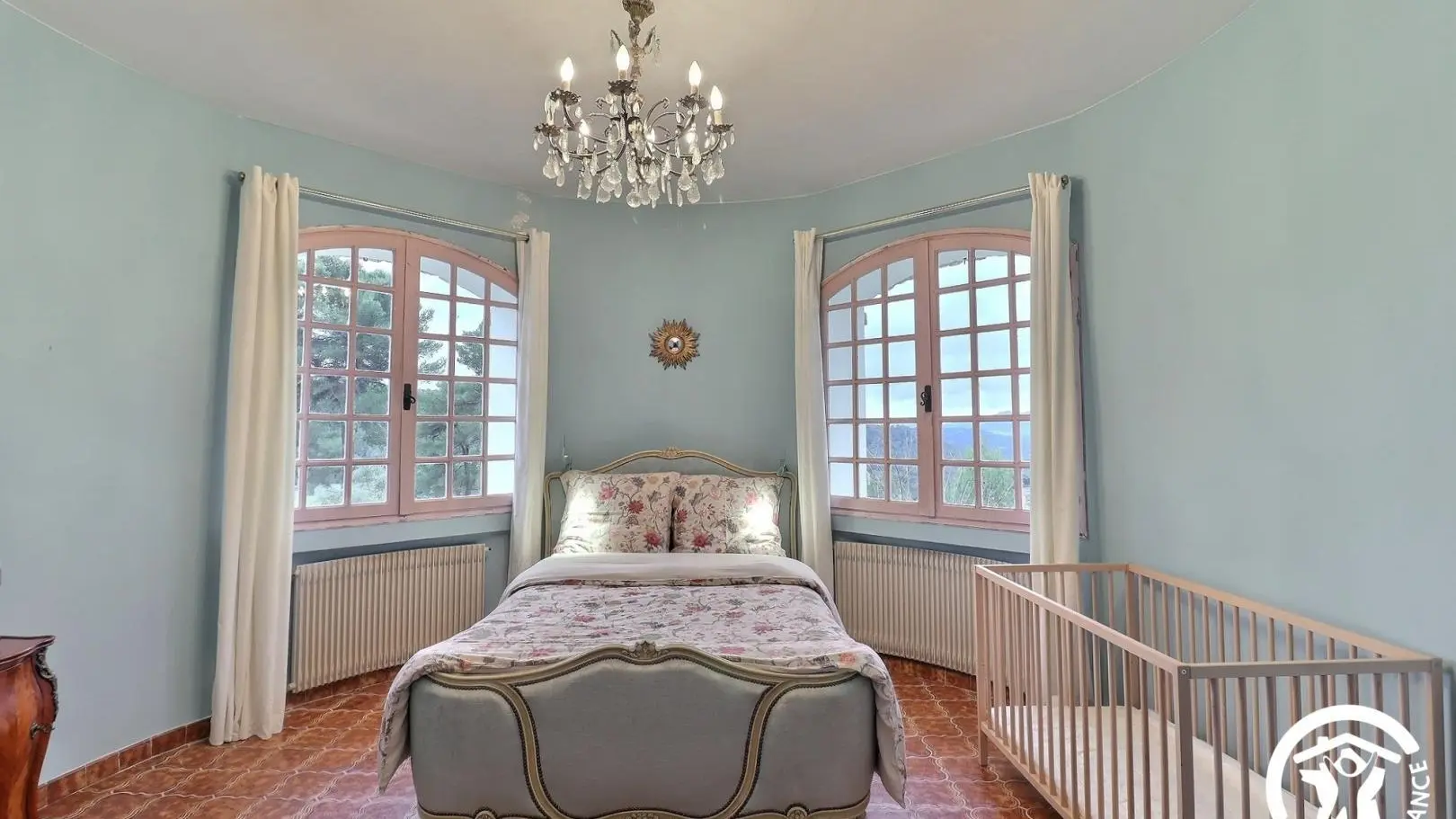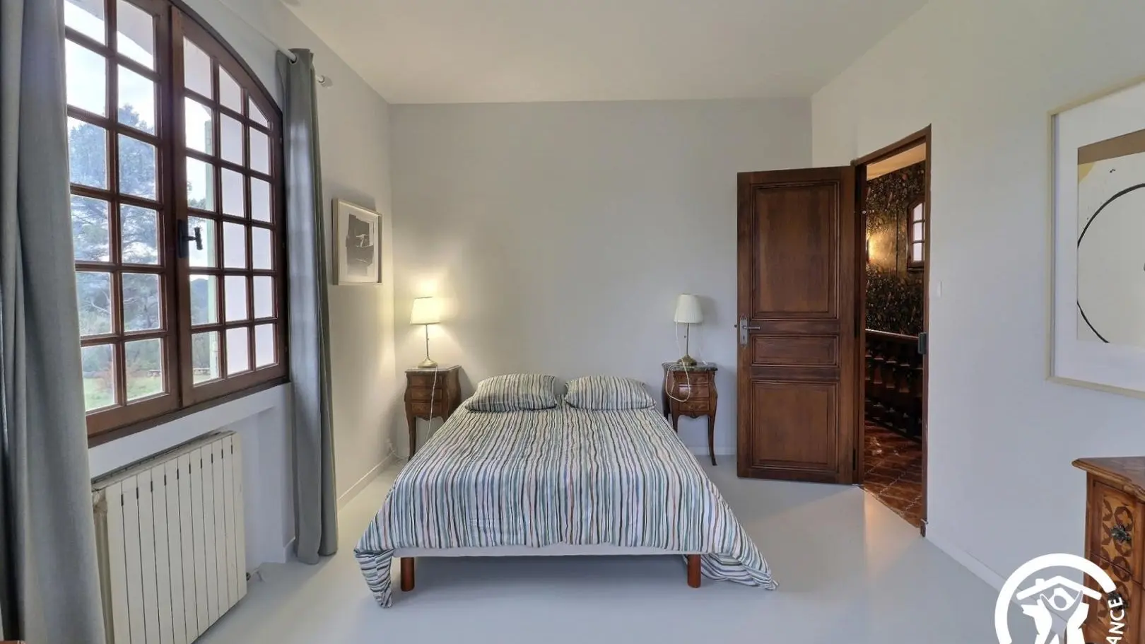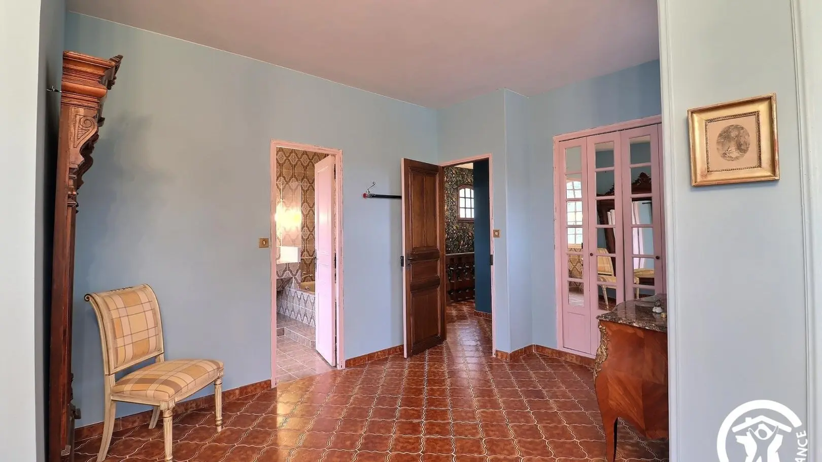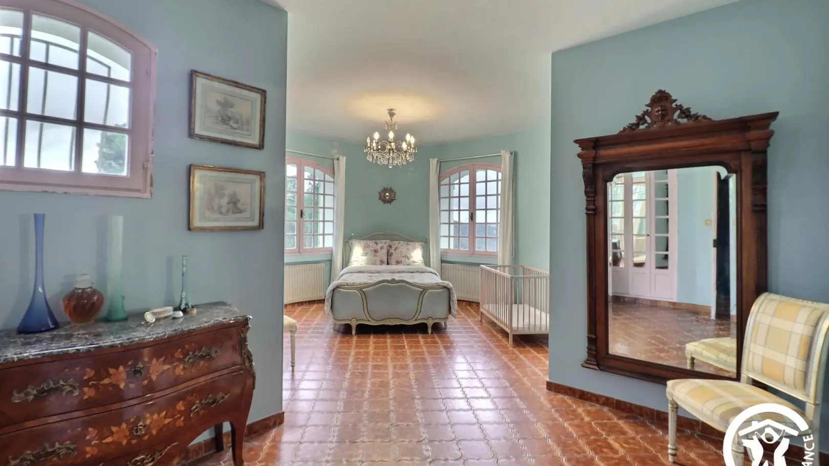 - Une grande chambre avec un lit 140x190, placard, lit bébé et salle d'eau attenante avec baignoire, meuble double vasque.