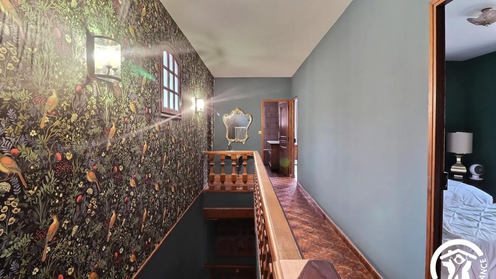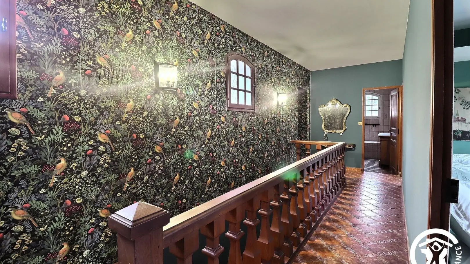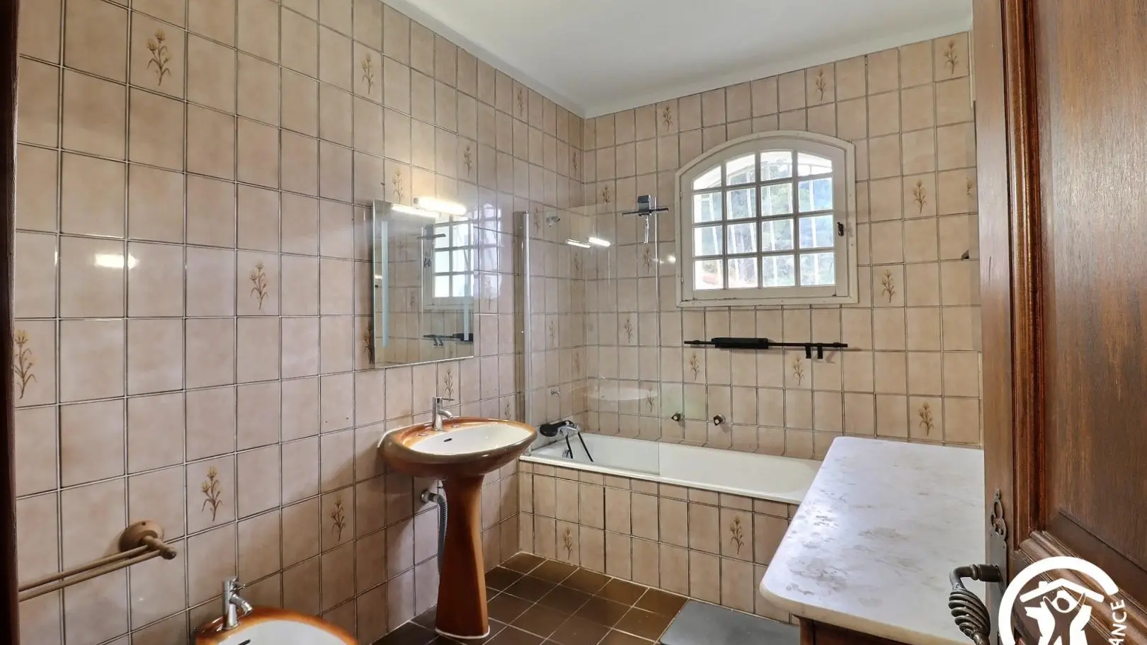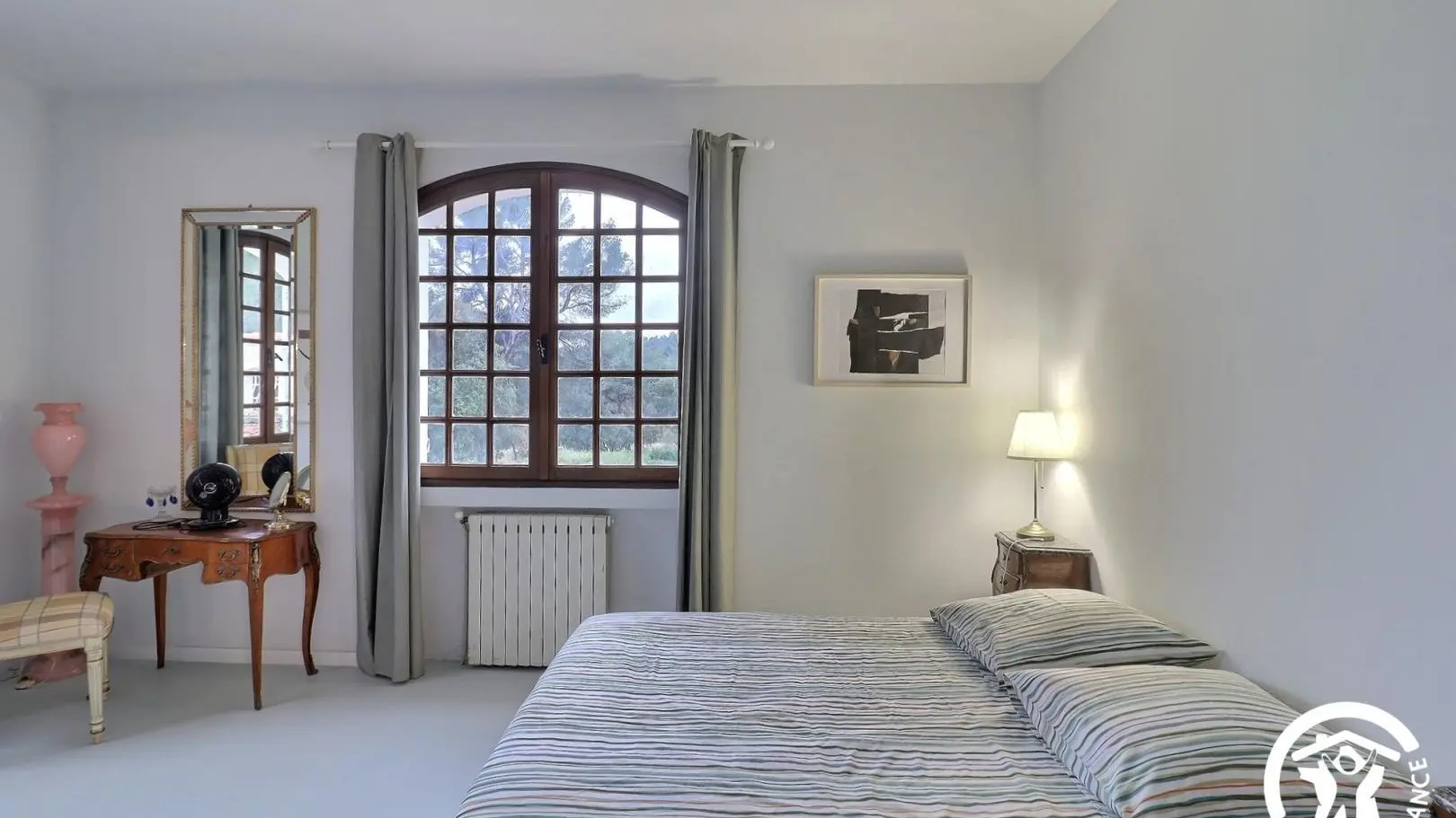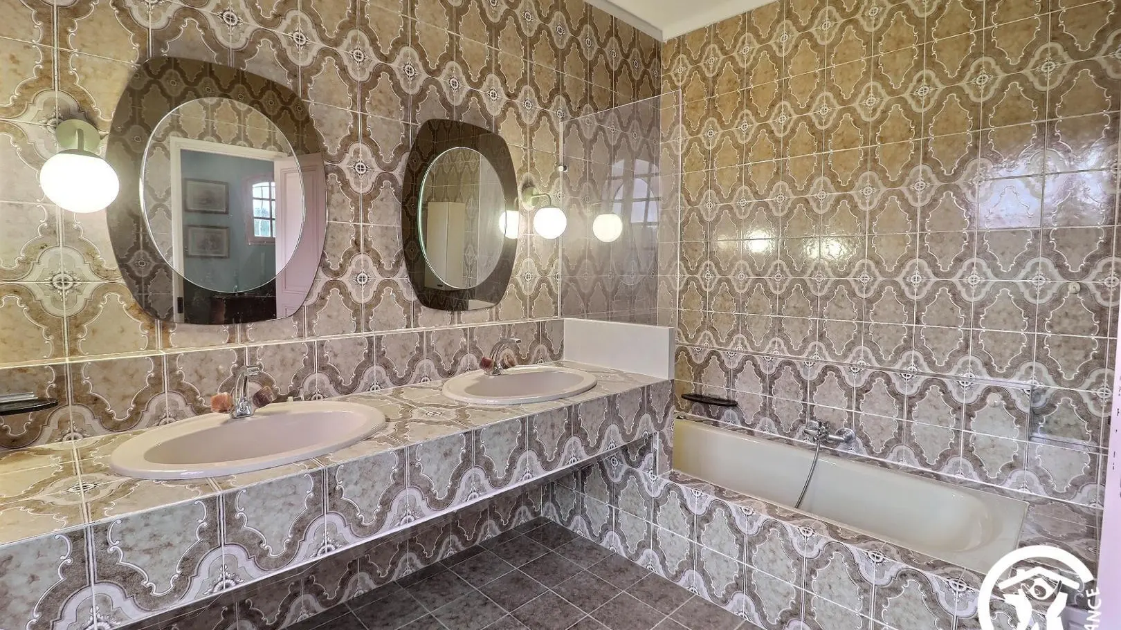 - Une grande chambre avec un lit 140x190, placard, lit bébé et salle d'eau attenante avec baignoire, meuble double vasque.