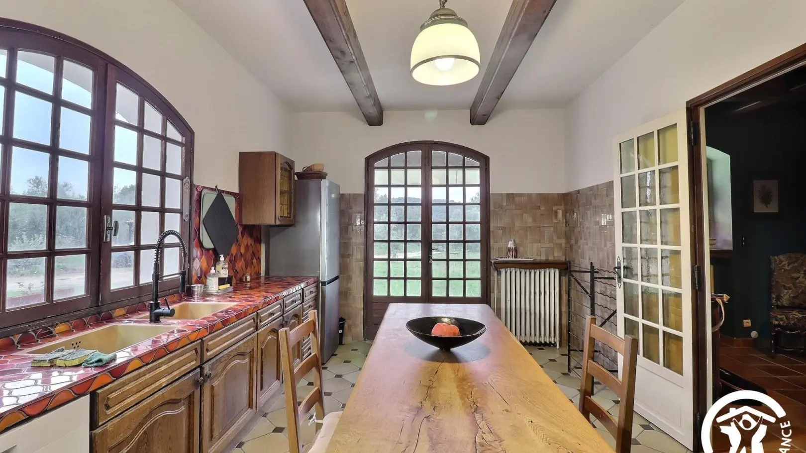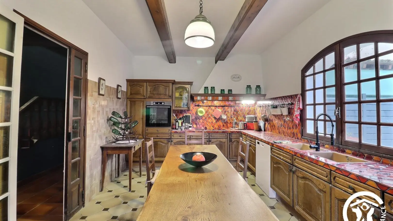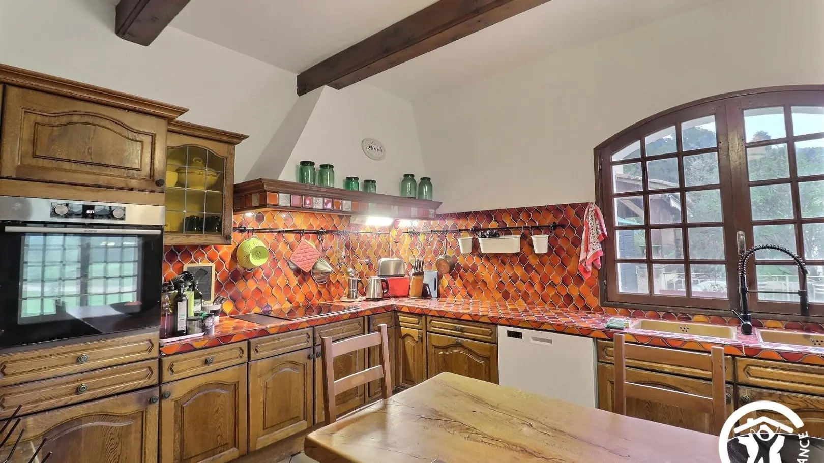 - Une cuisine équipée avec four, plaque de cuisson 3 feux, grille-pain, bouilloire, lave-vaisselle, réfrigérateur congélateur, table et chaises