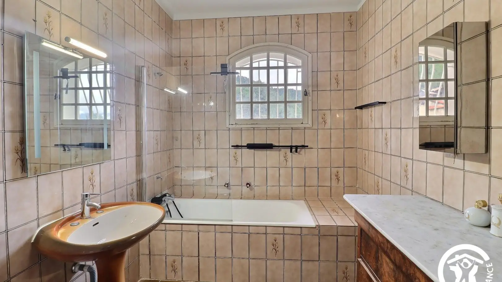 - Une salle de bain avec baignoire et vasque