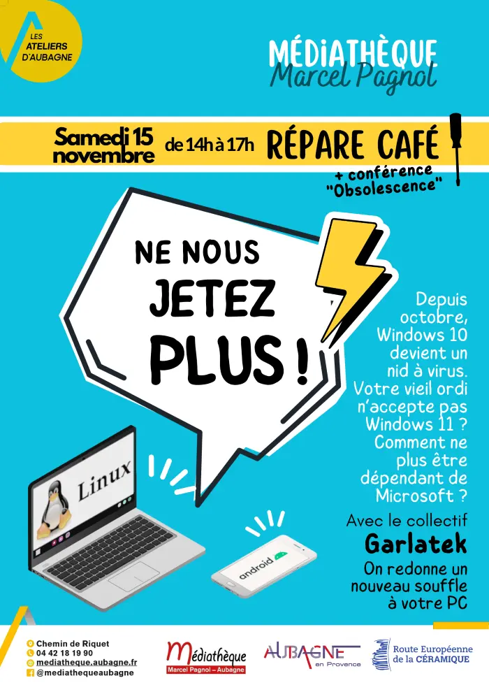 L’obsolescence programmée nous pousse à remplacer nos ordinateurs et téléphone alors qu’ils pourraient encore fonctionner. Depuis octobre, Windows 10 n’est plus mis à jour et les failles de sécurité sont désormais assaillies par les virus. Alors faut-il jeter votre ancien PC qui marche toujours, pour en acheter un neuf ? Votre PC est vieux et lent ? Pas de panique le collectif Garlatek vous aide à donner un second souffle à votre appareil ! La médiathèque et Garlatek vous proposent :